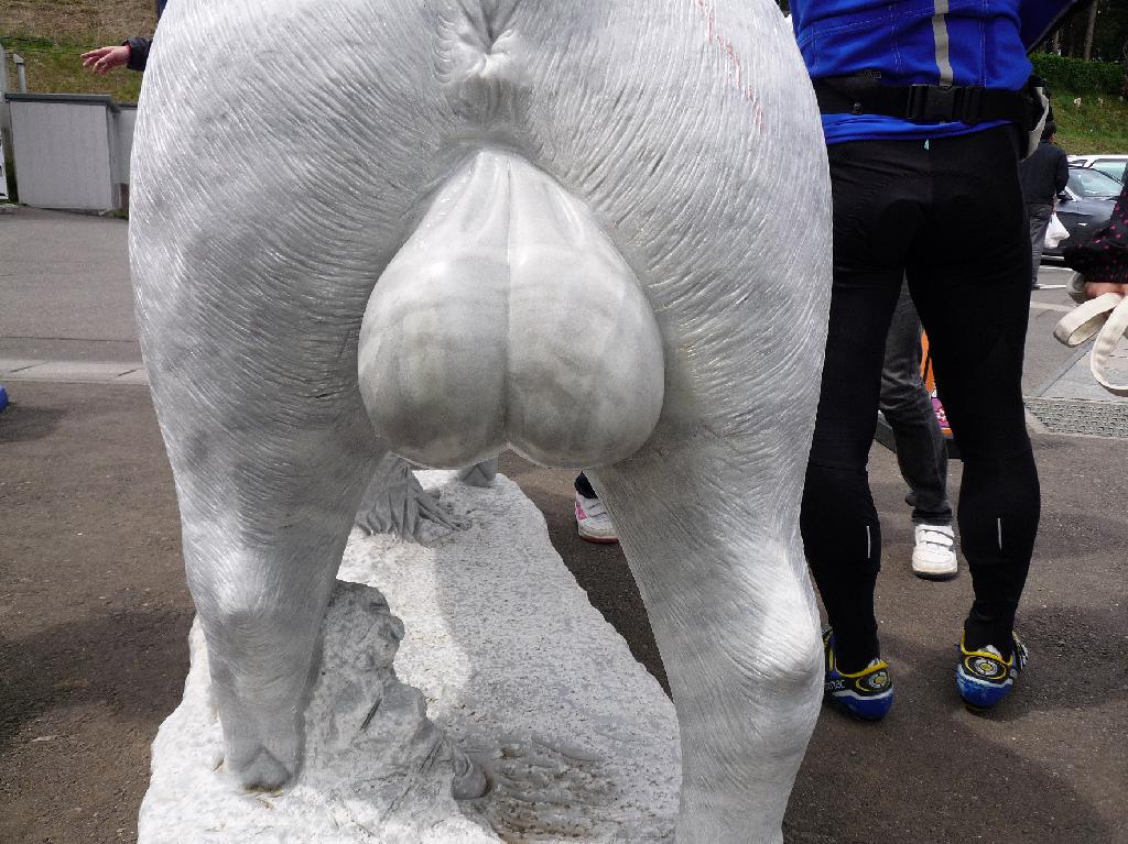 先回りのサポートカー部隊と巨大豚石像に出迎えられて、いい湯へ到着。